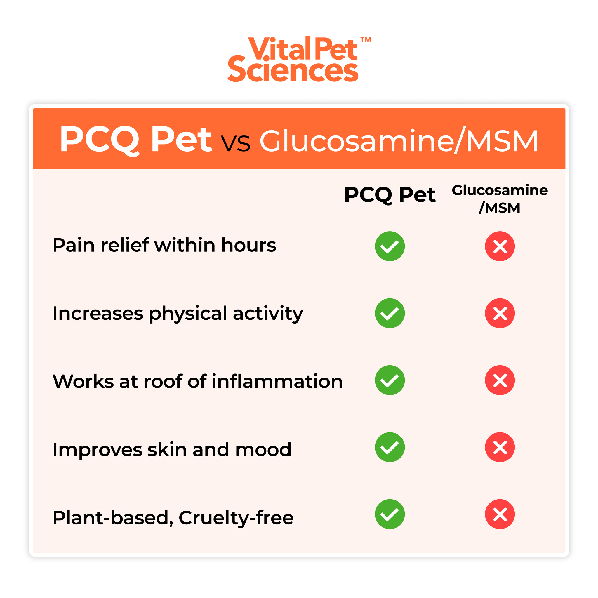 Works Better Than Most Alternatives - Unlike common supplements such as glucosamine and MSM, PCQ Pet works at the root of inflammation and pain, for a fast-acting, long-lasting effect.